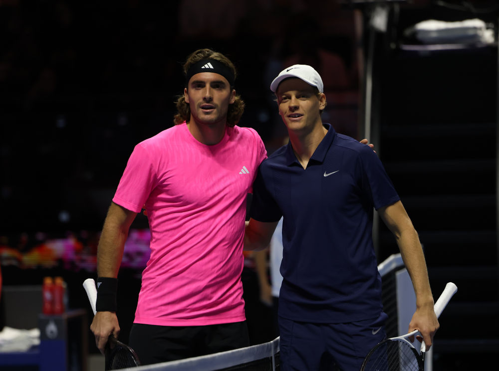 10月15日,辛纳(右)和齐齐帕斯在赛前合影。新华社记者 王海洲 摄