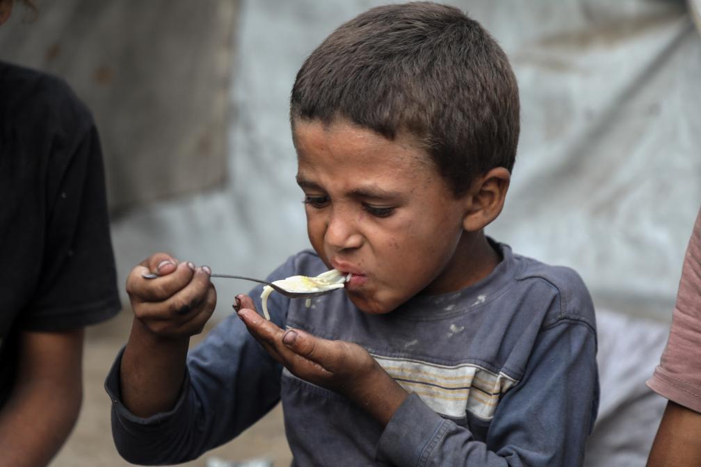 2025年7月29日,在加沙城的一个帐篷里,一名男孩在进食。当地许多家庭仅靠少许入境加沙地带的人道主义援助物资维系生存。新华社发(里泽克·阿卜杜勒贾瓦德摄)