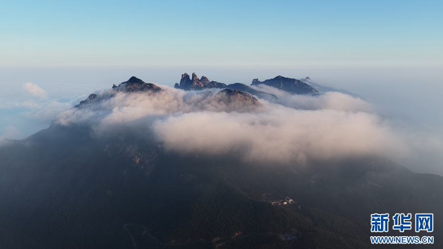 秋日时节,安徽省池州市九华山风景区出现壮丽云海。云涛在山峦间翻涌,巍峨山峰若隐若现,与日出霞光相互映衬,绘就宛如仙境的山水画卷。