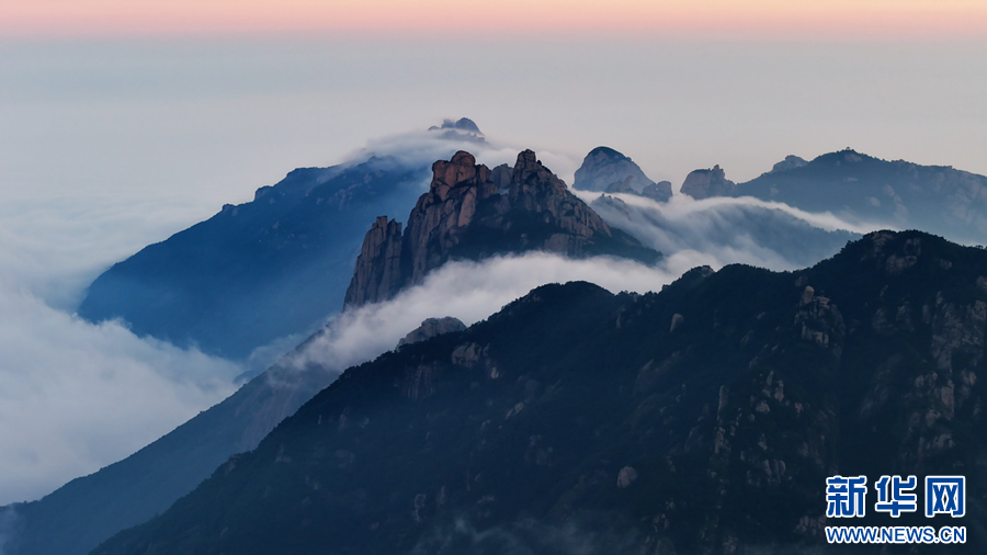 秋日时节,安徽省池州市九华山风景区出现壮丽云海。云涛在山峦间翻涌,巍峨山峰若隐若现,与日出霞光相互映衬,绘就宛如仙境的山水画卷。(陈英杰 王帆)